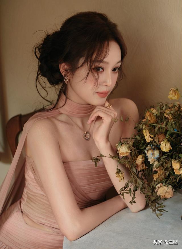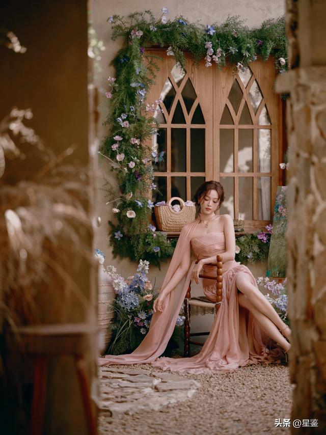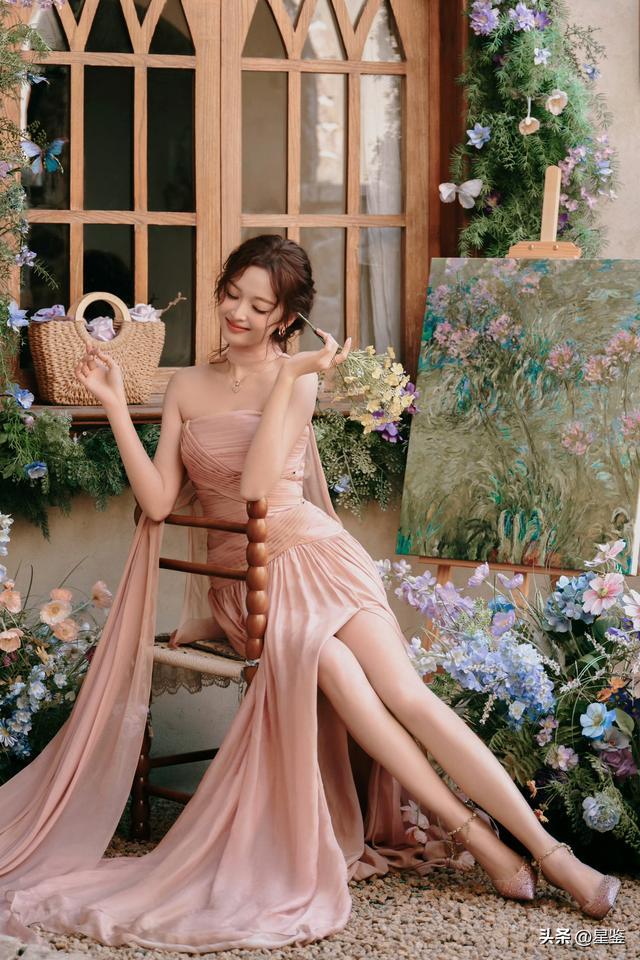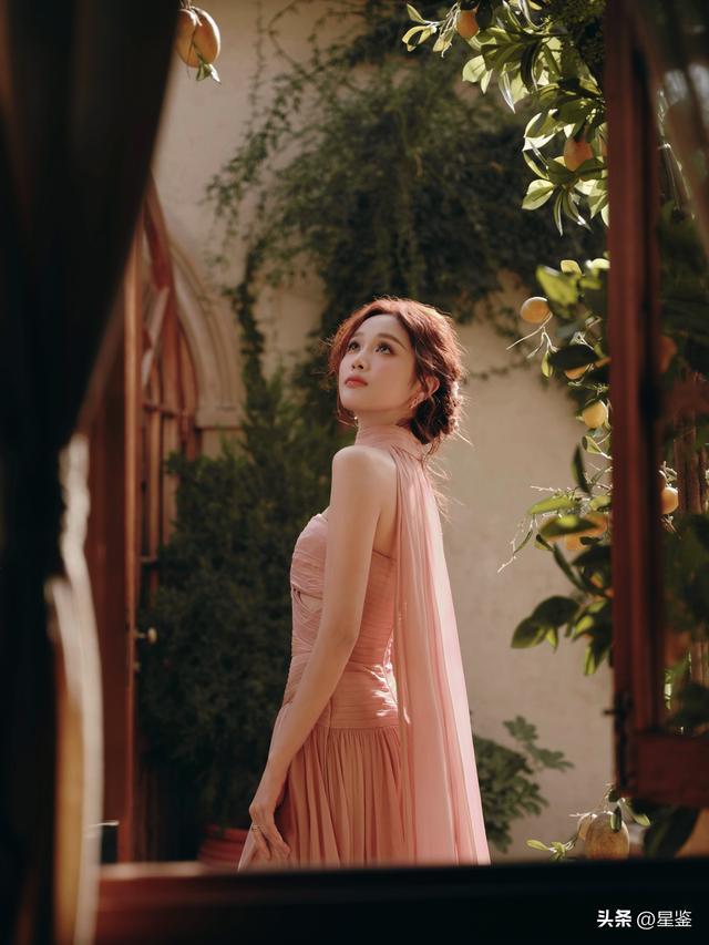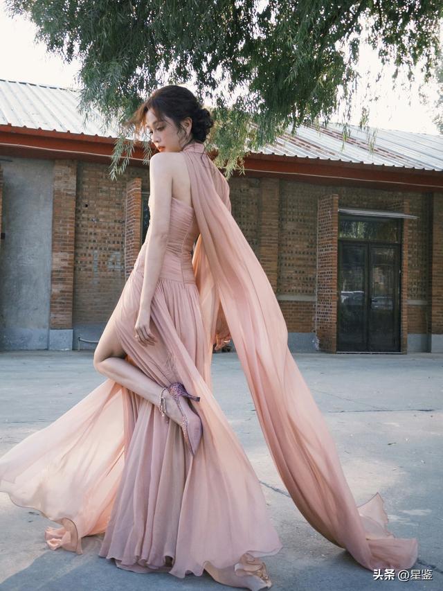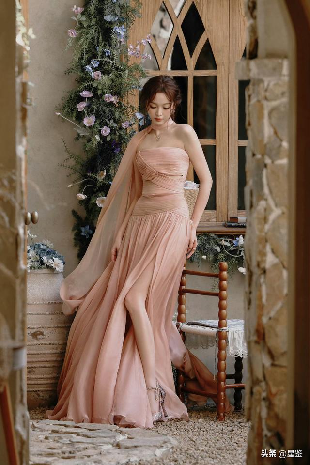 一身裸粉色纱质长裙,没有多余的印花和夸张的设计,却靠面料和剪裁撑起了全场的质感。抹胸的设计利落干净,露出流畅的肩颈线条,搭配同色系飘带,行走时随风而动,像自带柔光滤镜,把柔而不弱的松弛感拉满。高腰线和开叉的设计,悄悄优化了身材比例,又不会显得刻意,反而多了几分灵动。